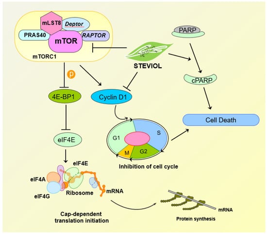 Steviol is a natural compound with several beneficial properties including its sweet taste, low toxicity, and that is safe for human use. Since 2011, it has been approved for use in the food sector, and their safety has been assessed by several bodies, including the World Health Organization (WHO), and an ADI (Acceptable Daily Intake) [47,48]. Long-term human trials have been performed to assess the effect of orally administered stevioside at doses of 200–1500 mg/day [48]. Studies have also suggested its role as an anti-diabetic as well as anti-inflammatory, and anti-cancer roles [14,49]. Our studies demonstrate the growth inhibitory action of steviol in human pancreatic cancer (HPAF-II and AsPC1) cells via inducing apoptosis, as indicated by PARP cleavage and upregulation in Bax and inhibition in Bcl-2 and Bcl-xl. Steviol arrests cell-cycle progression in the G1 phase and lowers the glucose uptake/lactate production in pancreatic cancer cells. Additionally, steviol affected the expression of the key components of translation initiation machinery in pancreatic cancer cells (HPAF-II and AsPC1).