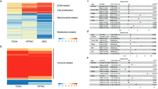 Molecular and clinical relevance of three previous CRC subtyping systems. (a). A p-value heatmap representing dysregulated gene sets between advanced- and early-stage of CRC (early-stage was used as control). (b). A p-value heatmap representing dysregulated gene sets between MSI-H and non-MSI-H CRC (non-MSI-H group was used as control). In the heatmaps, columns correspond to different cohorts, and rows to gene sets. Values in the heatmaps were −log10 (FDR adjusted p-value) transformed. Red color indicates up-regulated gene sets, and green means down-regulated gene sets in the control groups. Gene sets were grouped into different functional categories, with representative functional names shown on the right hand of the heatmaps, respectively. Forest plots of Cox PH regression models illustrated the HRs, 95% CIs and log-rank p-values for different subtyping systems (stage, MSI, CMS, etc.) and confounder factors (age, gender, etc.) for DFS in the TCGA (c), CPTAC (d), and GEO (e) cohorts. Log-rank p-value significance levels were given by stars: * <0.05, and ** <0.01.