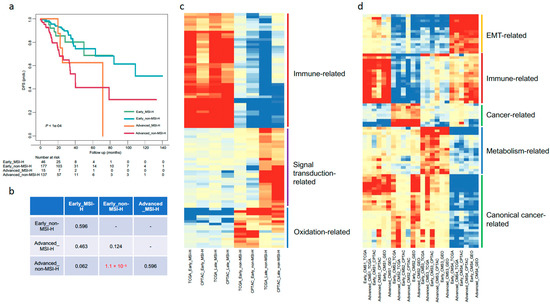 Stage_MSI and Stage_CMS molecular and clinical implications. (a). Kaplan–Meier survival curve comparing DFS of the four groups (Early_MSI-H, Early_non-MSI-H, Advanced_MSI-H, and Advanced_non-MSI-H) in the TCGA cohort. The indicated p-value was calculated with the log-rank test. (b). Summary table of the pairwise comparisons of survival curves between the four groups. Survival difference was tested using the log-rank test, with FDR adjusted p-values less than 0.05 were considered statistically significant and displayed in red color. (c). A p-value heatmap representing dysregulated gene sets between early_MSI-H, early_non-MSI-H, advanced_MSI-H, and advanced_non-MSI-H groups. (d). A p-value heatmap representing dysregulated gene sets between CMS 1-4 (in early stage) and CMS 1-4 (in advanced-stage) groups. In the heatmaps, columns correspond to different groups, and rows to gene sets. Values in the heatmaps were −log10 (FDR adjusted p-value) transformed. Red color indicates up-regulated gene sets, and green means down-regulated gene sets in the corresponding groups. Gene sets were grouped into different functional categories, with representative functional names shown on the right hand of the heatmaps accompanied by a colored line, respectively (such as maroon for immune-related, orange for EMT-related, and blue for metabolism-related gene sets).