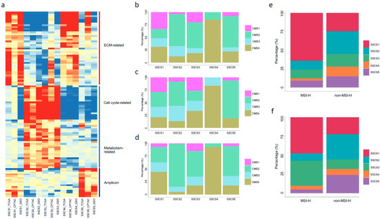 SSCS subtypes molecular features and comparisons with other subtypes. (a). A p-value heatmap representing dysregulated gene sets between the five SSCS subtypes. In the heatmap, columns correspond to different subtypes in the three cohorts, and rows to gene sets. Values in the heatmap were −log10 (FDR adjusted p-value) transformed. Red color indicates up-regulated gene sets, and green means down-regulated gene sets in the corresponding groups. Gene sets were grouped into different functional categories, with representative functional names shown on the right hand of the heatmap accompanied by a colored line, respectively (such as light red for EMT-related, light green for cell cycle-related, and blue for metabolism-related gene sets). The patient’s proportion bar plots illustrate the percentage intersections between the SSCS and CMS labels in the TCGA (b), CPTAC (c), and GEO (d) cohorts. The patient’s proportion bar plots illustrate the percentage intersections between the SSCS and MSI labels in the TCGA (e) and CPTAC (f) cohorts.
