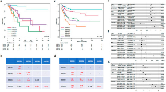 SSCS subtypes clinical characteristics. Kaplan–Meier survival curves comparing DFS of the five SSCS subtypes in the TCGA (a) and GEO (c) cohorts. The indicated p-values were calculated with the log-rank tests. Summary tables of the pairwise comparisons of survival curves between the five SSCS subtypes in the TCGA (b) and GEO (d) cohorts. Survival differences were tested using the log-rank tests, with FDR adjusted p-values less than 0.05 were considered statistically significant and displayed in red colors. Forest plots of Cox PH regression models illustrated the HRs, 95% CIs and log-rank p-values for different subtyping systems (SSCS, MSI, CMS, etc.) and confounder factors (age, gender, etc.) for DFS in the TCGA (e), CPTAC (f), and GEO (g) cohorts. Log-rank p-value significance levels were given by stars: * <0.05, ** <0.01, and *** <0.001.