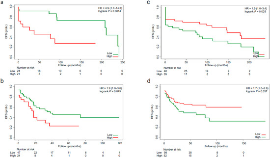 We next evaluated the six TME cell types (neuron, fibroblast, memory CD4+ T, cDC, naive B and naive CD4+ T cells) prognostic performances within the SSCS subtyping system. For each cell type, Cox regression models were built to stratify the patients within each SSCS subtype, and log-rank tests were utilized to test the survival differences between the high- and low-risk groups, respectively. No cell types can be used to stratify the patients into prognostic groups for OS (Table 2). Two cell types (fibroblast and cDC) were identified to be useful for identifying high- and low-risk groups within the SSCS subtyping system for DFS (log-rank p < 0.05; Table 2). More specifically, tumor-infiltrating fibroblast was found to be predictive for poor DFS only within the SSCS4 subtype (Table 2). From the TCGA SSCS4 patients (n = 45), we built a Cox model and calculated the median risk score (−0.059). The model was applied to classify the SSCS4 patients both from the TCGA (n = 45) and GEO (n = 79) cohorts into high-risk (>−0.059) and low-risk (<−0.059) groups. Compared with patients with low-risk scores, patients with high-risk scores had shorter DFS (TCGA: HR 4.9, 95% CI 1.7–14.3, p = 0.001; GEO: HR 1.9, 95% CI 1.0–3.6, p = 0.045) (Figure 6a,b). cDC, on the contrary, was associated with favorable DFS in the SSCS3 subtype. Cox model was built by using the abundance of the cDC, and patients were classified into high-risk (<0.054) and low-risk (>0.054) groups based on the median risk score (0.054) determined in the SSCS3 subtype from the TCGA cohort (n = 79). Patients with low-risk scores had favorable DFS (TCGA: HR 1.9, 95% CI 1.0–3.4, p = 0.035; GEO: HR 1.7, 95% CI 1.0–2.8, p = 0.037) (Figure 6c,d).