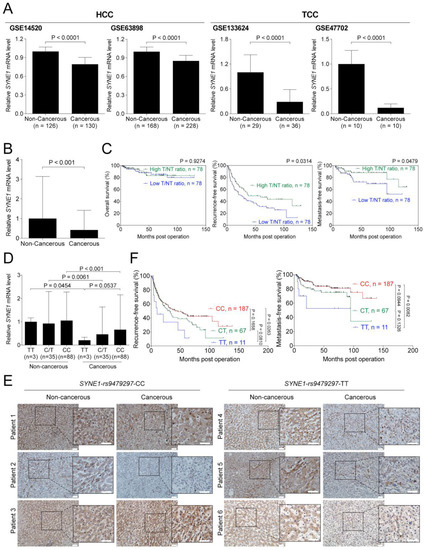 3.4. SYNE1 Expression is Downregulated in HCC and TCC and Associated with Clinical Outcomes in HCC Patients