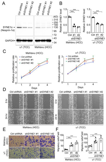3.6. SYNE1 Silencing Promotes Cell Proliferation and Migration in HCC and TCC Cells