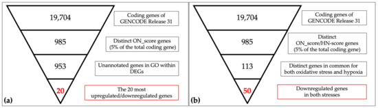 Schematic views of narrowing down the genes in oxidative/hypoxic transcriptome meta-analysis. (a) The 19,704 coding genes indexed for the reference genome were filtered by ON_score and by excluding Gene Ontology (GO) annotated genes to retrieve the 20 most differentially expressed genes (DEGs). (b) The number of genes downregulated in oxidative stress and hypoxia was then obtained as per the schematic in the figure.
