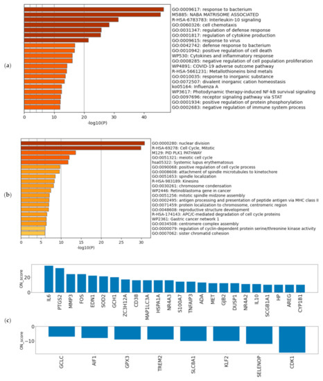 A schematic view of the analysis is shown in Figure 1. The most upregulated 493 genes and the most downregulated 492 genes, in a total of 985 genes (5% of the total coding genes in GENCODE Release 31 (GRCh38.p12)), were retrieved by ON_score 10 as DEGs. We performed gene set enrichment analysis using Metascape to visualize the characteristics of the DEGs. The analysis showed that the 493 most upregulated genes by OS were related to “GO:0009617: response to bacterium” and “M5885: NABA matrisome associated” (Figure 2a). The 492 most downregulated genes by OS were related to “GO:0000280 nuclear division” and “R-HAS-69278: Cell Cycle, Mitotic” (Figure 2b). We then found that 32 out of 985 genes were common to genes annotated with GO:0006979 (response to oxidative stress). The most upregulated genes common to GO annotation were IL6, PTGS2, and MMP3, and the most downregulated genes common to GO annotation were CDK1, SELENOP, and KLF2 (Figure 2c). The same procedure to verify the DEGs retrieved by ON_score 5 was also performed [23]. The use of ON_score 5 reveals a gene set that includes genes not as differentially expressed as ON_score 10. This shows the broader characteristics of the OS. We used ON_score 5 in the analysis of Section 3.4.