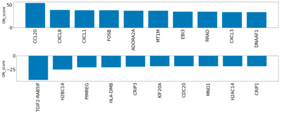 ON_score for the ten most upregulated and downregulated genes after extraction of annotated genes with GO:0006979 (response to oxidative stress).