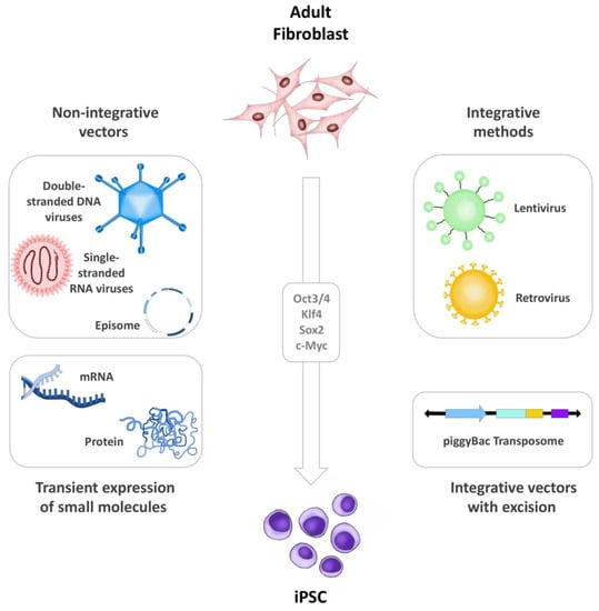 The first iPSCs were generated through virus-mediated (mainly lentiviruses and retroviruses) transduction of transcription factors, leading to direct integration within the host cell genome, which remains the gold standard of iPSC generation today. However, methods that circumvent genome modification, also called non-integrating techniques, are being extensively developed and evaluated [27,28,29]. Indeed, the dominant trends in reprogramming technology are designed to prevent insertional mutagenesis (by using non-integrative approaches) and contamination of donor cells with co-cultured feeder cells (by using xeno-free conditions and defined extracellular matrix components). The most widely adopted methodologies include the use of direct non-integrative vectors (e.g., single-stranded RNA viruses; double-stranded DNA Viruses and episomes) [30,31,32,33]. Here, Sendai virus (SV), a single stranded negative-sense RNA virus that replicates in the cytoplasm, is widely used in a broad range of research experiments mainly due to its high transduction efficiency, its rapid detectable transgene expression and its auto-erasable nature as a vector [34,35,36]. SV replicates independent of cell cycle, unlike other approaches where the exogenous genes are expressed only as the cell divides, producing very high copy numbers of the target gene. Notably, SV is particularly useful when reprogramming derived blood cells, such as CD34 positive cells, T-cells, and PBMCs, but also work well with fibroblasts, keratinocytes, and other cell-types [37,38]. Other non-integrative methods include integrating vectors that exhibit subsequent excision (e.g., piggyBac transposons) [39,40,41], or transient expression of small molecules (e.g., mRNA or proteins) (Figure 1) [42,43,44,45].