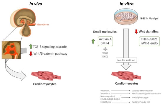 iPSC cardiac differentiation. Illustration showing the in vivo and in vitro methods for iPSC cardiac differentiation, including small molecules and Wnt signaling downregulation. Insulin is a necessary step to mature CMs into a beating state. The figure was designed and hand-drawn by CG-M.