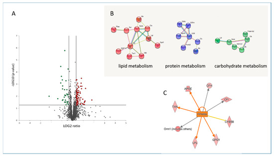Changes in the cardiac proteome after treatment with fenofibrate. Volcano plot represents the distribution of all quantified proteins in cardiac tissue after treatment with fenofibrate. Deregulated proteins (+1.3-fold; p < 0.05) are highlighted in green (downregulated) and red (upregulated) (A). Protein–protein interactions were analyzed by the STRING software tool. Available online: (http://string-db.org) (accessed on 14 October 2021). indicating the most affected protein clusters (B). Prediction of activation of PPARα (orange colour) based on deregulated proteins. The upregulated proteins are marked in red (C). The analyses were generated using Ingenuity® Pathway Analysis. Available online: (https://www.qiagenbio-informatics.com/products/ingenuity-pathway-analysis) (accessed on 14 October 2021). The full protein names are provided in Tables S1 and S2.