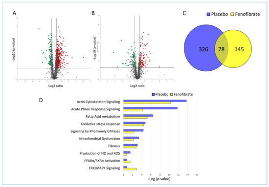Changes in the proteome of irradiated heart with and without fenofibrate treatment. Volcano plots represent the distribution of all quantified proteins in irradiated cardiac tissue without (A) or with (B) fenofibrate. Deregulated proteins (±1.3-fold; p < 0.05) are highlighted in green (downregulated) and red (upregulated). The full protein names are provided in Table S1. A Venn diagram illustrating the shared deregulated proteins between the two experimental groups (C). The most significant canonical pathways altered in both proteome profiles (D). The analyses were generated by Ingenuity® Pathway Analysis. Available online: https://www.qiagenbio-informatics.com/products/ingenuity-pathway-analysis) (accessed on 14 October 2021). Bars indicate canonical pathways with the enrichment significance shown on the horizontal axis (-log p-value). Longer bars indicate a higher significance of the pathway.