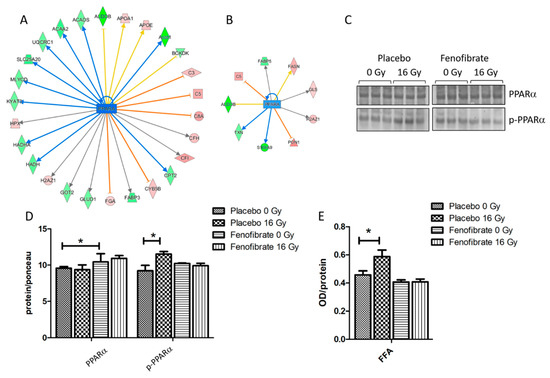 Analysis of the cardiac PPARα and serum FFA. Graphical representations of the deregulated protein networks with their upstream transcriptional regulators PPARα in the irradiated heart after treatment with placebo (A) and fenofibrate (B). The upregulated proteins are marked in red and the downregulated are marked in green. The nodes in blue (inhibition) and orange (activation) represent transcription factors. The analyses were generated using Ingenuity® Pathway Analysis. Available online: https://www.qiagenbio-informatics.com/products/ingenuity-pathway-analysis) (accessed on 14 October 2021). The full protein names are given in Table S1. Immunoblot analysis of PPARα was performed in mouse hearts (C). The amount of total protein was measured by Ponceau S staining. The columns represent the average ratios of relative protein expression in control and irradiated samples after background correction (±SEM) (t-test; * p < 0.05; n = 3) (D). The amount of the FFA was measured in 100 µg of serum using ELISA (+SEM) (t-test; * p < 0.05; n = 5) (E).