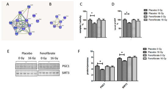 The effect of fenofibrate on mitochondria of irradiated heart. The cluster of deregulated mitochondrial proteins in the irradiated heart without (A) and with (B) fenofibrate treatment. Analysed by STRING software. Available online: (http://string-db.org) (accessed on 14 October 2021). The activity of complex I (C) and the level of cardiac ATP (D) were measured and expressed as a percentage compared to sham-irradiated, placebo-treated mice. The error bars represent standard error of the mean (±SEM) (t-test; * p < 0.05; n = 5). Immunoblot analysis of PGC1 and SIRT3 (E). The amount of the total protein was measured by Ponceau S staining for an accurate comparison between the groups. The columns represent the average ratios of relative protein expression in control and irradiated samples (F). The error bars represent standard error of the mean (±SEM) (t-test; * p < 0.05; n = 3).