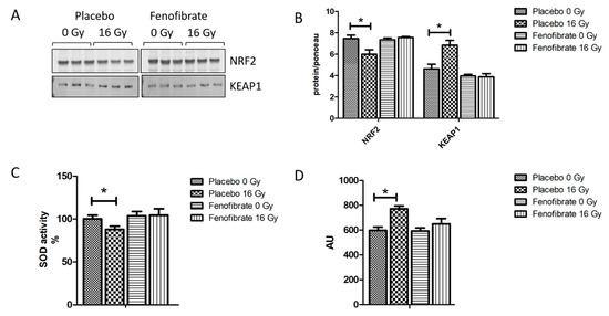 Impairment of the mitochondrial respiratory complexes contributes to the formation of reactive oxygen species and thereby increases oxidative stress [32]. The proteomics data suggested that the activation of PPARα reduced radiation-induced oxidative stress. To validate this finding, the expression levels of nuclear factor erythroid 2-related factor 2 (NRF2), the main regulator of the oxidative stress response, its repressor Kelch ECH associating protein 1 (KEAP1), the activity of SOD (oxidative response enzyme) and the level of malondialdehyde modification (oxidative stress marker) were measured using immunoblotting and ELISA. A marked decrease in the expression level of NRF2 (Figure 5A,B), increased KEAP1, reduced SOD activity (Figure 5C), and increased levels of lipid peroxidation (Figure 5D) were observed in irradiated hearts. However, these levels were returned to normal when mice were treated with fenofibrate (Figure 5A–D).