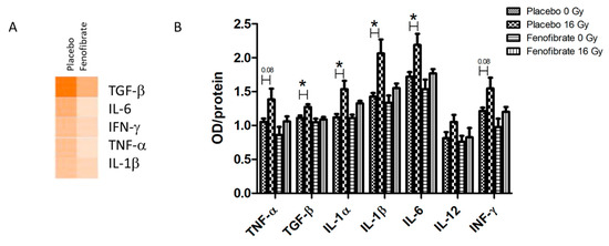 The analysis of serum cytokines. Graphical representations of the potential upstream transcriptional regulators predicted to be affected in the irradiated heart after treatment with placebo and fenofibrate (A). The predictions were generated based on the deregulated proteins using Ingenuity® Pathway Analysis. Available online: (https://www.qiagenbio-informatics.com/products/ingenuity-pathway-analysis) (accessed on 14 October 2021). The scores of activities are displayed using an orange colour gradient where a darker colour corresponds to a high score (high statistical significance) (A). The level of cytokines was measured in 100 µg of serum using ELISA. The error bars represent standard error of the mean (±SEM) (t-test; * p < 0.05; n = 5) (B).