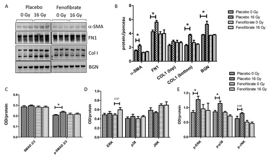 The effect of fenofibrate in counteracting the upregulation of TGF-β in the serum of irradiated mice prompted us to examine whether the activation of PPARα attenuates radiation-induced tissue remodeling and fibrosis. Therefore, the expression levels of alpha-smooth muscle actin (α-SMA), a marker of fibroblast differentiation, as well as fibronectin (FN1), collagen I (COLI) and biglycan (BGN)—markers of tissue fibrosis—were measured using immunoblotting. The analysis demonstrated that the levels of α-SMA, FN1, COLI and BGN were increased in irradiated hearts, whereas treatment with fenofibrate could reverse these changes and return them to the control levels (Figure 7A,B).