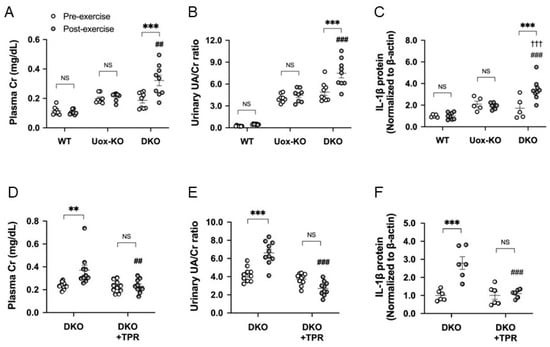 EIAKI of high HPRT activity Urat1KO-UoxKO mice and effects of topiroxostat. (A) Plasma Cr (mg/dL), (B) urinary UA/Cr ratio, (C) pro-IL-1β in kidney of WT (B6), high HPRT activity UoxKO (Uox-KO) and high HPRT activity Urat1KO-UoxKO (DKO) mice at pre- (open circles) and post-exercise (dark circles) state. (D) Plasma Cr (mg/dL), (E) urinary UA/Cr ratio, (F) pro-IL-1β in the kidney of the DKO control and topiroxostat-treated DKO (DKO+TPR) mice. Significant difference from pre-exercise group (** p < 0.01, *** p < 0.001), WT mice group (††† p < 0.001) and Uox-KO group (A–C: ## p < 0.01, ### p < 0.001) or DKO control group (D–F: ## p < 0.01, ### p < 0.001). NS, not significant (p > 0.05). Figures are from the reference [10].