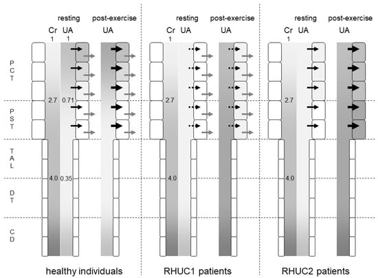Predicted intraluminal/plasma concentration ratio of creatinine and urates along the nephron segments of healthy individuals, RHUC1 and RHUC2 patients at resting or post-exercise state. The gradation represents the intraluminal/plasma concentration ratio of creatinine (Cr) and urates (UAs). The darker gradation indicates a higher intraluminal/plasma concentration ratio. The intraluminal/plasma concentration ratio of Cr was predicted to be 2.7 and 4.0 at the late proximal convoluted tubule (PCT) and early distal tubule (DT), respectively. In healthy individuals, the intraluminal/plasma concentration ratio of UA was predicted to be 0.71 and 0.35 at the late PCT and early DT, respectively. Black and gray arrows represent the urate influx via URAT1 and the urate efflux via GLUT9, respectively. Large black arrows at post-exercise state indicate the enhanced urate influx via URAT1 by lactate. Dashed black arrows indicate a small urate influx via another unidentified urate transporter. At a post-exercise state, the plasma urate concentration of RHUC patients increased to reach that of healthy individuals at resting state. The darker gradation indicates that the intraluminal/plasma UA concentration ratio at the proximal straight tubule (PST) and the thick ascending limb (TAL) in RHUC patients should be higher than those in healthy individuals. The intracellular urate concentration of the proximal tubule cells in RHUC2 patients was predicted to be higher than that in RHUC1 patients. CD: collecting duct.