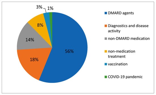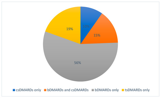 A total of 41/72 (56.9%) studies were related to DMARDs in the fields of JIA, including JIA-associated uveitis. Industry sponsors were involved in 27/41 studies. A total of 14/41 studies were sponsored by academia only. Studies addressed conventional synthetic DMARDs (csDMARDs; 10/41 studies), biological DMARDs (bDMARDs; 29/41 studies, hereof six studies also including csDMARDs), and targeted synthetic DMARDs (tsDMARDs; 8/41 studies). Conversely, 31/41 studies on DMARDs did not involve any csDMARD as a variable or control, and only 4/41 studies did not involve any bDMARD or tsDMARD, as seen in Figure 2. Biosimilar DMARDs were not involved.