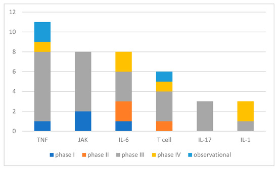 Unsurprisingly, in clinical studies in the field of JIA, DMARDs are the big player. The introduction of biological and targeted synthetic DMARDs have tremendously changed the game up to today [2,4,7]. The longer goal of treatment is not only to improve complaints and disabilities, but also to achieve complete disease control for the best long-term outcome. The most frequent targets in DMARD treatment (by the count of registered studies and enrollments) are TNF, JAK, IL-6, and T cell. Of these, JAK inhibitors are the most recently introduced class of pharmaceutics to JIA. Baricitinib and Tofacitinib have comparable study numbers and enrollments in current research, as earlier introduced TNF inhibitors. In contrast, similar novel IL-17 inhibitors (IXE, SEC) are tested in distinctly fewer studies with smaller enrollments, which might be due to a limited application field in ERA and JPsA concerning JIA. Few novel agents were tested for targets with longer available bDMARDs, namely TNF (Certolizumab, phase III) and IL-6 inhibitors (Sarilumab, phase II). Furthermore, studies on IL-1 antagonist agents had a smaller part in DMARD studies, which are relevant only for systemic JIA in the field of JIA, besides other indications such as hereditary fever syndromes.
