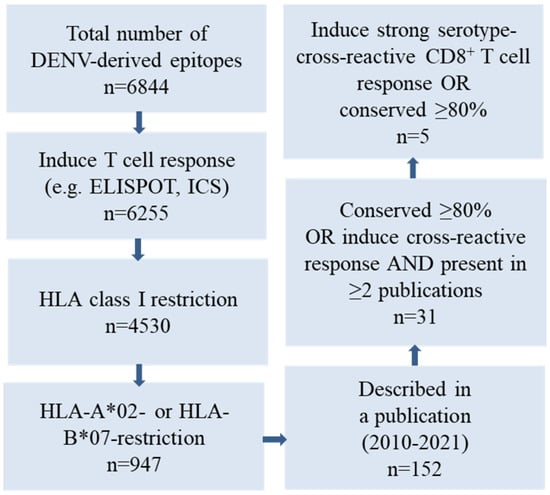 Selection of DENV-derived epitopes based on a query of the Immune Epitope Database (IEDB) of the NIAID. Five DENV-derived HLA-A*02- or HL-B*07-restricted epitopes were selected according to the magnitude of cross-reactive functional CD8+ T cell responses reported and/or conservation among the various DENV serotypes.