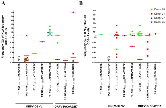 ORFV-DENV induces CD8+ T cells against several DENV-derived epitopes within the same individual in vitro. The responses of each donor are identified with different symbols and colors, as shown. Each symbol corresponds to a biological replicate exhibiting a positive response out of thirty (Donors 78, 27, and 25) or twenty (Donor 31) replicates. Effective priming was verified by (A) HLA tetramer staining and/or (B) ICS. Data for only four donors are shown. Cells from a fifth donor (data included in Table 2 only) showed a cytokine response to a pool of HLA-A*02-restricted DENV and control peptides; the specificity of the observed responses against individual peptides was not determined due to rapid cell death. CD8+ T cells from a sixth donor were not primed against any of DENV-derived or control epitopes (data not included). N/D, not determined (negative).