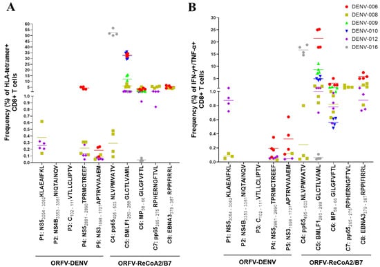 Restimulation of CD8+ T cells from six confirmed DENV-positive donors with ORFV-DENV. The responses of each donor are identified with a different symbol and color, as shown. Each symbol corresponds to a biological replicate exhibiting a positive response. Specific CD8+ T cell activation was verified by (A) HLA tetramer staining and/or (B) ICS. PBMCs from donor DENV-015 showed no specific CD8+ T cell responses against any of DENV-derived or control epitopes after restimulation (data not shown).
