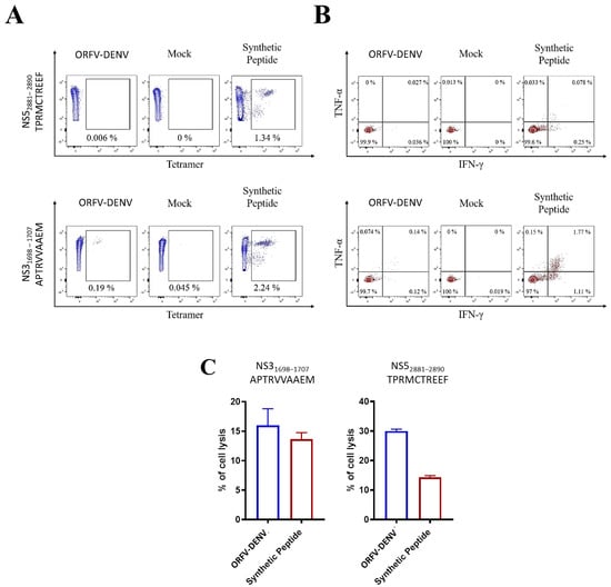 Cross-reactive CD8+ T cell responses in PBMCs from confirmed ZIKV-positive donor DENV-021 after in vitro restimulation with ORFV-DENV expressing DENV-derived peptide epitopes. Frequencies and functionality of epitope-specific CD8+ T cells were determined by (A) HLA tetramer staining, (B) ICS, and (C) specific lysis after 20 h of co-incubation with peptide-pulsed target cells at an effector-to-target ratio of 0.1:1. The percentage of target cell lysis corrected for spontaneous background lysis is shown. A synthetic peptide was used as a control.