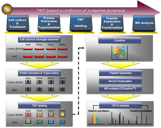Prostate cancer is the second leading cause of male cancer, and it is one of the most common causes of cancer death (after lung cancer) in the United States [1]. The development of prostate cancer is induced by androgens; thus, androgen-deprivation therapies, such as medical or surgical castration, are used to decrease the physiological androgen level in more than 30% of patients diagnosed with prostate cancer [2,3]. However, most patients treated with androgen-deprivation therapies experience a disease recurrence that is known as castration-resistant prostate cancer (CRPC). One mechanism responsible for the development of CRPC is the acquisition of the metabolic capability to convert steroid precursors to dihydrotestosterone (DHT), which leads to the activation of androgen receptor (AR) signaling [4,5,6,7]. AR, which is a member of the nuclear receptor superfamily, contributes to the development of both normal prostate and prostate cancer. The binding of a ligand to AR can induce the transcription of specific genes via a process that is known to require at least 60 min. However, several studies have shown that various signaling pathways are regulated by androgen stimulation at earlier time points (5 to 60 min), and that this rapid AR signaling contributes to prostate cancer cell proliferation [8,9,10]. The AR-mediated transcription of downstream genes requires a series of processes: DHT binds to AR in the cytoplasm; AR translocates to the nucleus; and the promoters of AR-dependent genes bind to coactivators and/or corepressors of canonical AR signaling. However, increasing evidence shows that the intracellular signaling pathways that contribute to AR-mediated cancer cell proliferation are triggered by a mechanism that is more complex than this canonical signaling [11,12,13]. This mechanism, which is induced at early time points, has been called “rapid” or “non-genomic” signaling and may initiate within seconds after DHT stimulation [14]. Since non-genomic signaling affects various intracellular responses, the analysis of androgen-regulated protein dynamics at early time points might provide insight into yet-unknown mechanisms of prostate cancer development. In addition, the large-scale systematic temporal proteomic analysis of cells under DHT treatment could improve our understanding of the dynamic AR singling network.