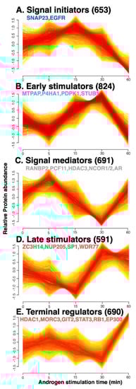Numerous proteins and multiple pathways can be involved in the downstream effects of androgen stimulation, regardless of whether the action is genomic or non-genomic. To systematically analyze the dynamic protein changes that occur during the non-genomic rapid androgen response, proteins that exhibited similar expression patterns over time were clustered by a fuzzy c-means (FCM) clustering algorithm that filtered out noisy profiles. We predicted the optimal number of clusters, which is unknown a priori, using the elbow method (Figure S2), and obtained five clusters of proteins (Figure 2). These included two clusters of the up-regulated proteins in the early time points (A and B), which were termed “signal initiators: and “early stimulators”, respectively. In addition, two clusters termed “late stimulators” and “terminal regulators” represented up-regulated proteins in the late time points (D and E, respectively), and one of signal mediator proteins which are up-regulated both in the early and late time points (C).