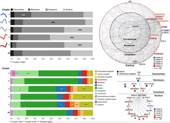 Inspired by the apparent correlation between the localizations and types of the enriched proteins of each cluster, we next examined how AR-interacting proteins might relate to the obtained androgen-response profiles. To achieve this goal, we used our identified proteome data in comparison to the public database to generate a high-confidence protein–protein interaction (PPI) network with an intra- and inter-molecular interaction of proteins in each cluster observed in different subcellular compartments. A global view of the proteome interactions of each cluster and the network of AR interactions for each cluster was further examined (Figure 3C,D). Most proteins identified in our study have interacts with EGFR, which are known to interact with the AR. EGFR physically interacted with 97 other proteins and thus functions as the main hub protein of this androgen-signaling network. Notably, EGFR showed 1.5 (=45/29) times more interaction with up-regulated proteins in the late time points (late stimulators or terminal regulators) than in the early time points (signal initiators or early stimulators), as also seen in the enrichment of the cytoplasm in Figure 3C. TP53, which is one of the most popular proteins involved in castration-resistant prostate cancer progression, interacted with 87 proteins and was the second most important hub protein. All proteins physically interacting with EGFR and TP53 found in VCaP cells elucidated by integrative analysis of PPI network and our proteome data were listed in Table S1, and the most top 15 high-degree hub proteins and AR were represented in a Figure 3C.