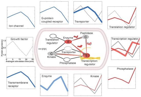We sorted the androgen-regulated proteins according to their molecular types (Figure 4) and found that they could be grouped into two major classes. One major class comprised ion channels, transmembrane receptors, G-protein coupled receptors, enzymes, and transporters (shown as blue lines in the outer squares of Figure 4). The main kinetic clusters in these protein categories were the signal initiators and early stimulators, which were consistently down-regulated in the late time points under androgen treatment. The second major class comprised translation/transcription regulators, phosphatases, and kinases (shown as red lines in the outer squares of Figure 4). These proteins were enhanced for late stimulators and terminal regulators, which showed increased expression over time under androgen stimulation. Our results reveal that the androgen signal can spread to transcriptional regulators within the short time frame of 60 min.