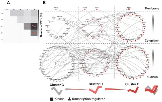 For each pair of protein clusters, we counted the number of PPIs between their member proteins and used these counts (%) to generate a heatmap. The PPIs found to be overrepresented in cluster pairs C/D, C/E, and D/E were used to construct a signaling network that was displayed on a two-dimensional plane (dynamic profile pattern vs. subcellular compartment). The proteins were distributed to nine separate regions, which were connected according to the human PPI network curated in BioGrid (https://thebiogrid.org, accessed on 21 March 2019). The line directions were drawn in order from A to E, based on the signal flows revealed in our analysis.