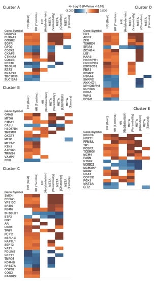 The proteins of the identified androgen-response profiles are associated with hormone-refractory prostate cancer and metastasis. The proteins of each cluster (cluster A, B, C, D, and E) were functionally characterized by searching an open database (Oncomine) for known marker genes. The analysis revealed that our clusters include many signature genes previously reported to be significantly up-/down-regulated (p-value < 0.05) in hormone-refractory (HR) or metastatic (META) prostate cancer. Genes that exhibited differential expression in at least two datasets are presented.