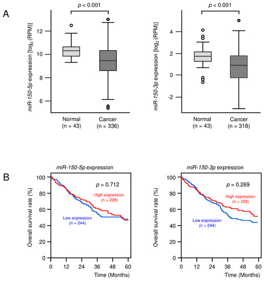 - Koshizuka, K.; Nohata, N.; Hanazawa, T.; Kikkawa, N.; Arai, T.; Okato, A.; Fukumoto, I.; Katada, K.; Okamoto, Y.; Seki, N. Deep sequencing-based microRNA expression signatures in head and neck squamous cell carcinoma: Dual strands of pre-miR-150 as antitumor miRNAs. Oncotarget 2017, 8, 30288–30304. [Google Scholar] [CrossRef] [PubMed] [Green Version]