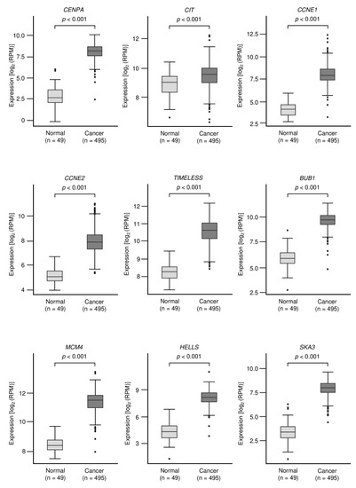- Waseem, A.; Ali, M.; Odell, E.W.; Fortune, F.; Teh, M.T. Downstream targets of FOXM1: CEP55 and HELLS are cancer progression markers of head and neck squamous cell carcinoma. Oral Oncol. 2010, 46, 536–542. [Google Scholar] [CrossRef] [PubMed] [Green Version]