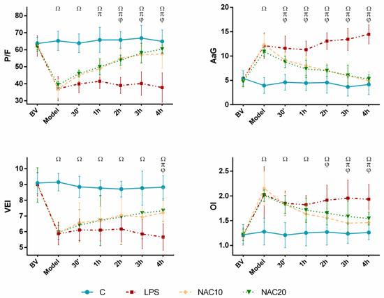 Respiratory parameters: the ratio of arterial oxygen partial pressure to fraction of inspired oxygen (P/F), alveolar-arterial gradient (AaG), ventilation efficiency index (VEI), oxygenation index (OI) before saline/LPS administration (basal value, BV) till experimental model condition (Model) and next 4 h in Control group (C), LPS untreated group (LPS), and LPS groups treated with 10 mg/kg of N-acetylcysteine (NAC10) or 20 mg/kg of N-acetylcysteine (NAC20). Data are presented as means ± SD. Statistical comparisons: for LPS vs. C Ω p < 0.001; for NAC10 vs. LPS φ p < 0.048 to 0.001; NAC20 vs. LPS π p < 0.032 to 0.001 and for NAC10 vs. NAC20 p > 0.05.