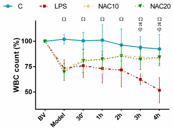 Percentage of total white blood cell (WBC) count in arterial blood before (basal value, BV), after LPS administration (Model) and during 4 h in the course of experiment in Control group, LPS untreated group, and LPS groups treated with 10 mg/kg of N-acetylcysteine (NAC10) or 20 mg/kg of N-acetylcysteine (NAC20), expressed in percentage (%). Data are presented as means ± SD. Statistical comparisons: for LPS vs. C Ω p < 0.001; for NAC10 vs. LPS φ p < 0.001; NAC20 vs. LPS π p < 0.003 to 0.001 and for NAC10 vs. NAC20 p > 0.05.