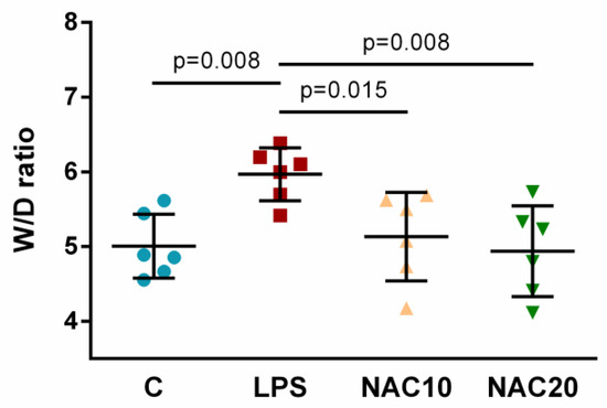 Instillation of LPS significantly increased lung oedema formation determined as wet-dry lung weight ratio (W/D ratio) compared to control group (LPS vs. C p = 0.008). Administration of NAC significantly reduced lung oedema formation (NAC10 p = 0.015; NAC20 p = 0.008) vs. LPS group. There were no significant differences between NAC10 and NAC20 (Figure 4).