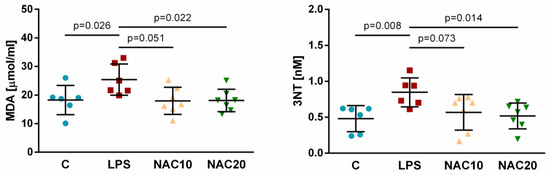 The values of Malondialdehyde (MDA) and 3-Nitrotyrosine (3NT) in lung tissue. Data are presented as individual values with means ± SD. Statistical comparisons: for LPS vs. C, NAC10 and NAC20 vs. LPS, NAC10 vs. NAC20.