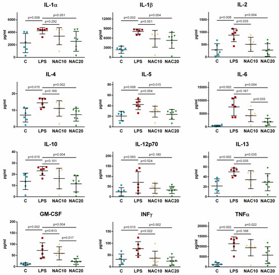 The levels of all investigated markers significantly increased in LPS group compared to the control group (all p < 0.05 to 0.002) except for IL-12p70 (LPS vs. C p = 0.093). Compared to LPS group, administration of NAC10 significantly reduced the levels of IL-2, IL-13, INFγ (for all p = 0.035 to 0.022). IL-1β (p = 0.051) and IL-5 (p = 0.054) oscillated on the border of significance. NAC at higher dose 20 mg/mL reduced the levels of IL-1β, IL-2, IL-4, IL-5, IL-6, IL-10, IL-13, GM-CSF, INFγ, TNFα (all p = 0.035 to 0.002) with IL-1α (p = 0.051) at borderline significance. Differences between NAC groups (NAC10 vs. NAC20) were significant for IL-6 (p = 0.035) and GM-CSF (p = 0.017) (Figure 6).