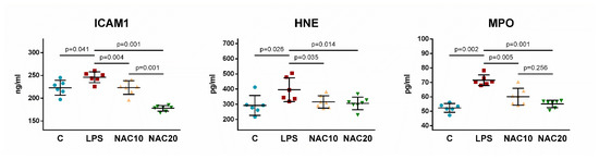 Levels of intercellular adhesion molecule-1 (ICAM1), 4-hydroxynonenal (HNE) and myeloperoxidase (MPO) in homogenized lung at the end of the experiment in Control (C) group, LPS untreated group, and LPS groups treated with 10 mg/kg of N-acetylcysteine (NAC10) or 20 mg/kg of N-acetylcysteine (NAC20). Data are presented as individual values with means ± SD. Statistical comparisons: for LPS vs. C, NAC10 and NAC20 vs. LPS, NAC10 vs. NAC20.
