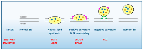 Once a positive curve has been generated at the LD baseline, cells are now able to store more TG and CE in between the phospholipid monolayers. As a result of such enhanced accumulation of neutral lipids, a simultaneous increase in the amount of PLs is necessary to maintain the biophysical properties of the monolayer of the nascent LD. This process requires the coordinate action of enzymes from the phospholipid biosynthetic and acyl chain remodeling pathways (i.e., phospholipid:acyl-CoA acyltransferases), the latter of which contribute to remove the lysophospholipids that accumulated in the membrane as a result of PLA2 action. As the LD emerges from the ER, a neutral curvature is established that stabilizes and protects the hydrophobic core from lipolysis [3,12,29].