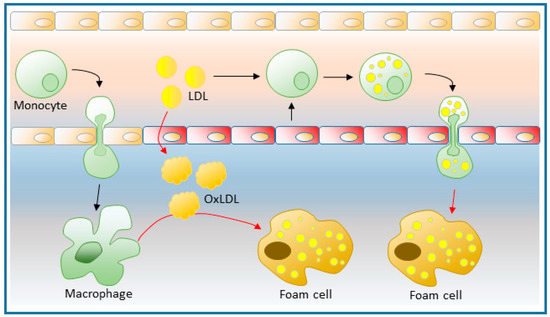Most monocytes that have gained access to the subendothelial space in early atherosclerotic lesions become cells with macrophage and/or dendritic cell characteristics, favored by the increased presence in situ of multiple differentiation factors secreted by the endothelial cells [65,66,67]. By internalizing modified LDL and storing its lipid constituents into cytosolic LDs, monocytes become fat-laden macrophages or foam cells, which reside in the vessel wall. As a consequence, a systemic low-grade inflammation is chronically established. Recent work has shown that a constant flux of monocytes from the bloodstream into the intima appears to be necessary for the atheromatous plaque to effectively progress [68]. Interest in the heterogeneity of macrophages in atherosclerotic lesions, in particular with regard to the macrophages involved in a proinflammatory process versus those participating in resolution and repair events, has prompted a large number of recent studies [69,70]. However, the results are yet inconclusive because in vitro studies do not adequately reproduce the situation existing in the atherosclerotic endothelium. The latter involves many different cell types, the role of which can vary according to the stage of the disease. For the purposes of this review, emphasis is placed on the role of circulating monocytes and the macrophage cells into which they differentiate. As pointed out above, the formation of LDs in the cytosol of these cells is a key factor to be taken into account in the onset of the disease.