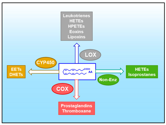 AA is the common precursor of the eicosanoids, a family of lipid mediators with key roles in physiology and especially in pathophysiological situations involving inflammatory reactions [36] (Figure 3). The potent biological activity of the eicosanoids requires the cells to exert a tight control on AA levels in a way that the availability of the fatty acid in free form is often a limiting factor for eicosanoid biosynthesis [87,88]. Of note, when present at sufficiently high concentrations, AA may be significantly converted to its two-carbon elongation product, adrenic acid (7,10,13,16-docosatetraenoic acid, 22:4n-6) [89,90,91], which can also be oxygenated to a variety of bioactive products [92,93,94].