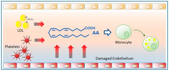 It has long been recognized that free AA is liberated in significant amounts into the bloodstream during the early stages of atherosclerosis [95]. Endothelial cells activated by oxidized LDLs and other stimuli constitute a major source of free AA [96,97,98]. In addition, the action of sPLA2s released from a variety of cells directly on the LDL-bound phospholipids constitutes another important source of AA released into the bloodstream [99,100,101,102]. Finally, platelets recruited to the activated endothelium also contribute to increase the availability of free AA [95] (Figure 4).