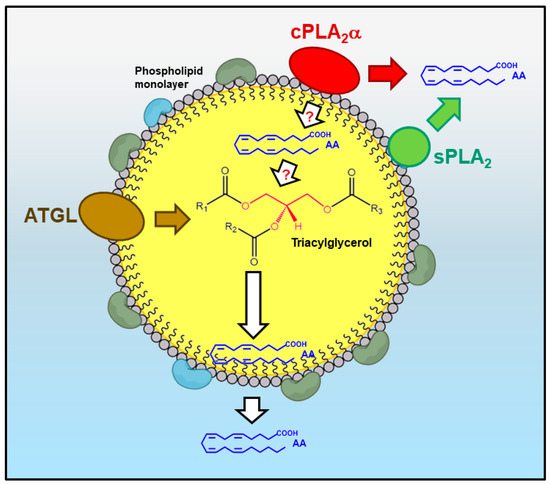 The association of the major AA-releasing enzyme cPLA2α with the LD monolayer [19,20] also strengthens the link between LDs and eicosanoid synthesis (Figure 5). In this particular aspect, however, it should be kept in mind that the ability of cPLA2α to directly hydrolyze AA-containing phospholipids at the LD monolayer has not been demonstrated [154]. Likewise, despite the fact that phospholipid-bound AA has been found in the LD monolayer [151], it has not been demonstrated either that the organelle itself can constitute a significant source of free AA for eicosanoid synthesis. It is possible that the free fatty acid derives from neighboring structures (i.e., ER, Golgi) which the cPLA2α also associates with [34] and is transferred to the cyclooxygenases and lipoxygenases residing in the LD by specific transporters.