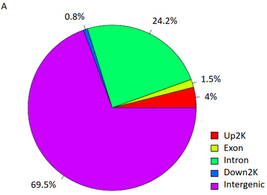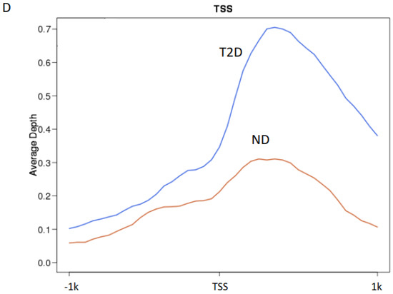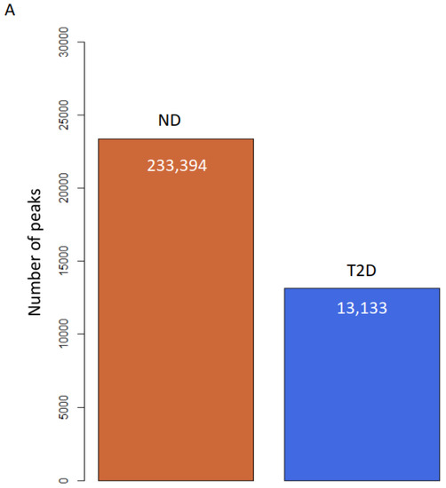 Individual heterogeneity could potentially impact variable peaks; therefore, to ensure that the observed trends were statistically significant, for each peak detected in ND or T2D individuals, we quantified the corresponding area under the curve in each patient and compared it with both ND and T2D groups. When comparing ND with T2D, we detected 80 peaks with a significant increase and 405 peaks with a significant decrease in H3K9ac with T2D (p < 0.05, Welch’s t test; Figure 2A,B).