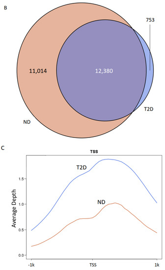 To study the role of H3K9ac in atherosclerosis patients with T2D, we profiled the genome-wide enrichment of H3K9ac by ChIP-seq in the PBMCs collected from patients with T2D (n = 8) or without T2D (ND, n = 10), all with advanced atherosclerotic disease. The H3K9ac peaks in each group were detected by the MACS2 peak calling method (FDR < 1 × 10−3). Differential peak enrichment was evaluated by assessing the enrichment of the corresponding region in individual samples. ChIP-seq peak calling detected 23,394 peaks in subjects without T2D and 13,133 peaks in subjects with T2D (Figure 1A). The difference in detected peaks indicates an overall decrease in the total number of H3K9ac peaks in T2D, which suggests a downregulation of H3K9ac in the T2D condition. There are 12,380 peaks common to both ND and T2D individuals (Figure 1B). When the constitutive peaks are compared to the remaining peaks in the T2D group, around 6% (753 peaks) of the peaks were redistributed in T2D, which may suggest different chromatin states in T2D (Figure 1B). We then compared the enrichment of the constitutive H3K9ac peaks around the transcriptional start sites (TSSs, ±1 kb), with that of the TSSs with no H3K9ac peaks. The levels of H3K9ac acetylation at the TSSs of constitutive peaks and no peaks-calling were both higher in T2D (Figure 1C,D). The TSSs of constitutive peaks showed a bimodal distribution in both +1kb and −1kb around the TSS (Figure 1C). In the TSSs where no H3K9ac peaks were called, distribution of H3K9ac acetylation was mostly enriched in +1kb of the TSSs (Figure 1D).