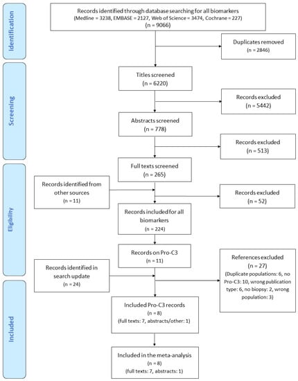 From the 35 records on Pro-C3 which were identified in the search, eight studies were eligible for inclusion in the systematic review. The study flow diagram is shown in Figure 1. Seven of the included studies were full text reports [,,,,,,] and one was an abstract [].